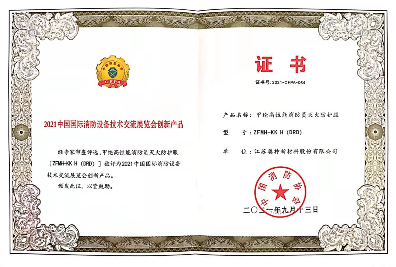 2021年10月12日,在北京召開(kāi)的第十九屆中國(guó)國(guó)際消防設(shè)備技術(shù)交流展覽會(huì)上,江蘇奧神新材料股份有限公司研發(fā)的“甲綸高性能消防員滅火防護(hù)服”憑借優(yōu)異的性能獲得“2021中國(guó)國(guó)際消防設(shè)備技術(shù)交流展覽會(huì)創(chuàng)新產(chǎn)品”榮譽(yù)稱(chēng)號(hào)。此次參與評(píng)選的都是來(lái)自全國(guó)各地實(shí)力雄厚的消防領(lǐng)域企業(yè),經(jīng)歷層層評(píng)選,甲綸高性能消防員滅火防護(hù)服脫穎而出,受到專(zhuān)家的一致好評(píng)。