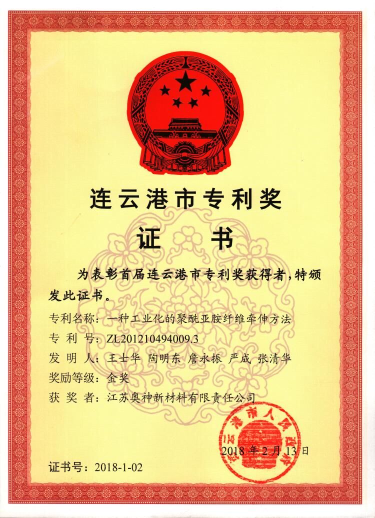 近日,連云港市政府發(fā)文,對首屆連云港市專利獎獲獎項目給予表彰,奧神新材料公司發(fā)明專利“一種工業(yè)化的聚酰亞胺纖維牽伸方法”獲得首屆連云港市專利金獎。據(jù)悉,本屆專利金獎有10項。