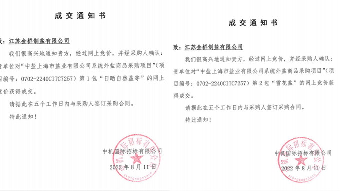 近日,我公司以網(wǎng)上競價的方式,成功中標中鹽上海市鹽業(yè)有限公司系統(tǒng)外鹽商品2022-2023年度采購項目,標的量1.5萬余噸。