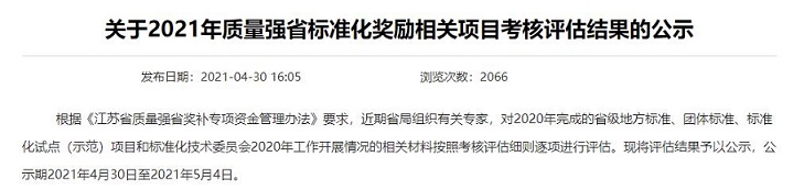 網(wǎng)址鏈接:江蘇省市場監(jiān)督管理局 綜合通知 關(guān)于2021年質(zhì)量強省標準化獎勵相關(guān)項目考核評估結(jié)果的公示 (jiangsu.gov.cn)