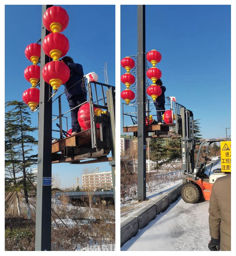 “亮華港城”。近期的一場大雪不僅給港城披上一件銀裝,也將花果山大道兩旁的路燈和燈籠刮落損壞。翔立鐵軍放棄休息奮戰(zhàn)在修復(fù)燈籠工程一線,保障了人民群眾的出行安全。