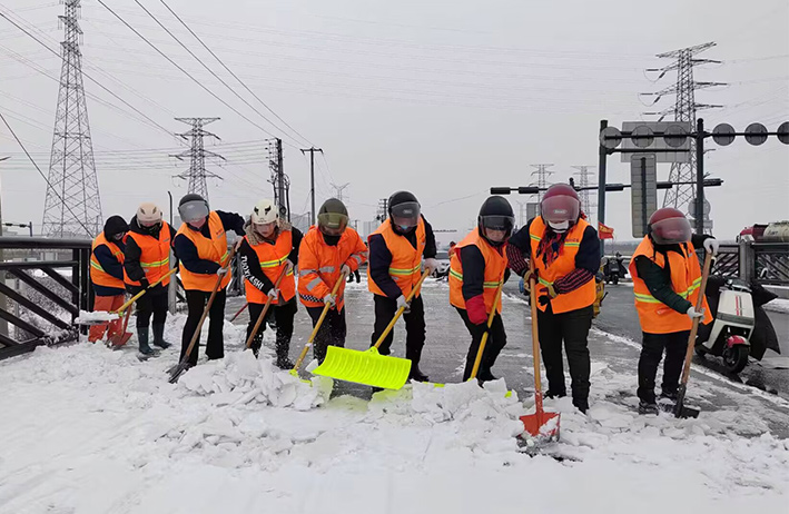 在白雪皚皚的雪地里,身穿橘黃工作服的保潔工人就是最美的點綴,他們頂著風(fēng)雪吹打臉頰,兩人一組、三人一對,配合默契,揮動手中鐵銑,用力拋灑融雪鹽斤80多噸,10余車。道路橋粱兩側(cè),人行輔道邊上,公司上下齊心協(xié)力,9名班長在公司統(tǒng)一調(diào)配下,帶領(lǐng)班組人員,人工清除大小橋梁兩側(cè)積雪30多座,人行輔道長達3000多米長,站臺、叉路口積雪100多處,為保障恢復(fù)雪后新城環(huán)境整潔而努力工作。大型清掃設(shè)備駕駛員全員齊上陣,安全行車裝運融雪鹽斤里程達200多公里,工作時長10個多小時,安全操作鋤雪機械清理張圩互通引橋,埒子口大橋等路段長達5000多米長,有力彰顯機械破冰、除雪強大功能。(楊波)