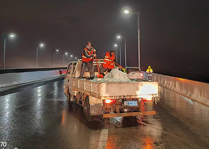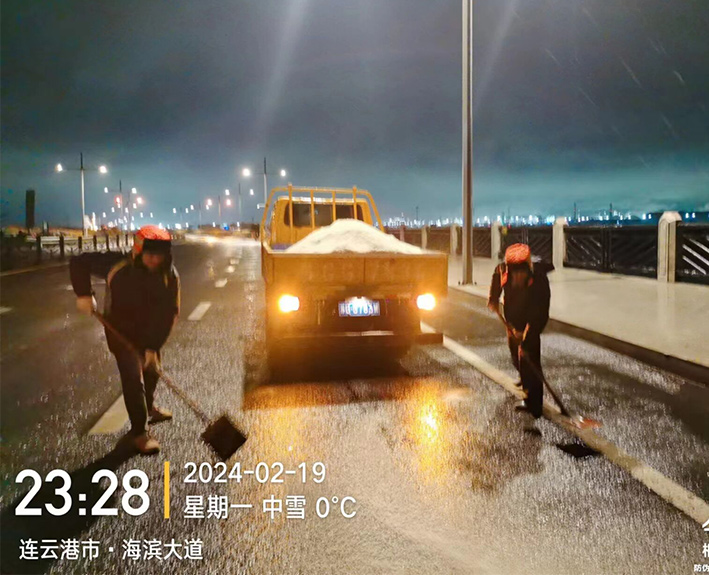 該公司迅速啟動突發(fā)天氣應(yīng)急保障預(yù)案,近30余名道路應(yīng)急排險突擊隊員,在公司統(tǒng)一按排下 ,裝車備運融雪鹽斤近15噸,現(xiàn)場工作中隊員們士氣高漲,無所畏懼。夜間8時左右,10余名黨員先鋒,兵分三路再次安全有序奔赴燒香河、海濱大道、228等路段橋梁,無懼大風夾著冰雨顆粒吹打臉頰,兩人一對、三人一組、揮動手中鐵銑,汗水與冰雨濕透橙色衣衫,經(jīng)過近4個多小時努力奮戰(zhàn),人工撒放融雪鹽斤近20余噸,高質(zhì)高效保障近30座橋梁安全通暢。