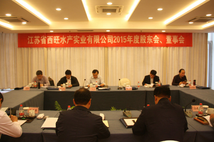 4月22日下午,江蘇省西旺水產(chǎn)實業(yè)公司2015年度股東會、董事會在墟溝召開,省沿海開發(fā)集團總經(jīng)理丁建奇、副總經(jīng)理周金陽等股東代表、董事代表出席了會議。會議由連云港市工業(yè)投資集團副總經(jīng)理楊國新主持。